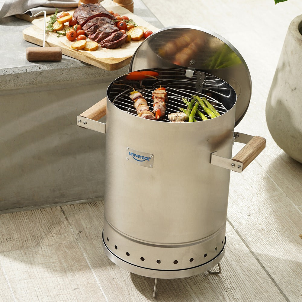 Barril ahumador en acero inoxidable con manijas en roble. Cuenta con 1 gancho jalador, 6 ganchos para colgar, una parrilla para asar y porta carbón. La tapa tiene en su interior un gancho en acero inoxidable para colgarla del cuerpo cuando se requiera.