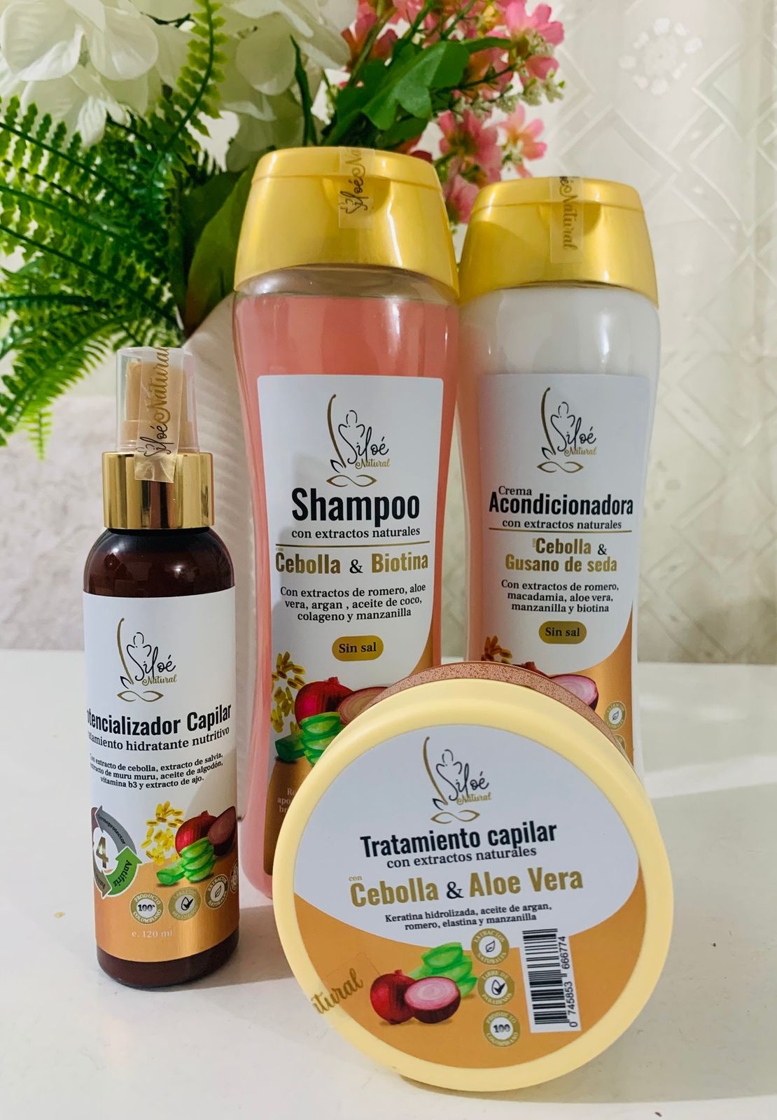 - TRATAMIENTO CAPILAR CEBOLLA Y ALOE VERA: Tratamiento con extractos naturales de 300ml se aplica como preshampoo y deja actuar 40 minutos