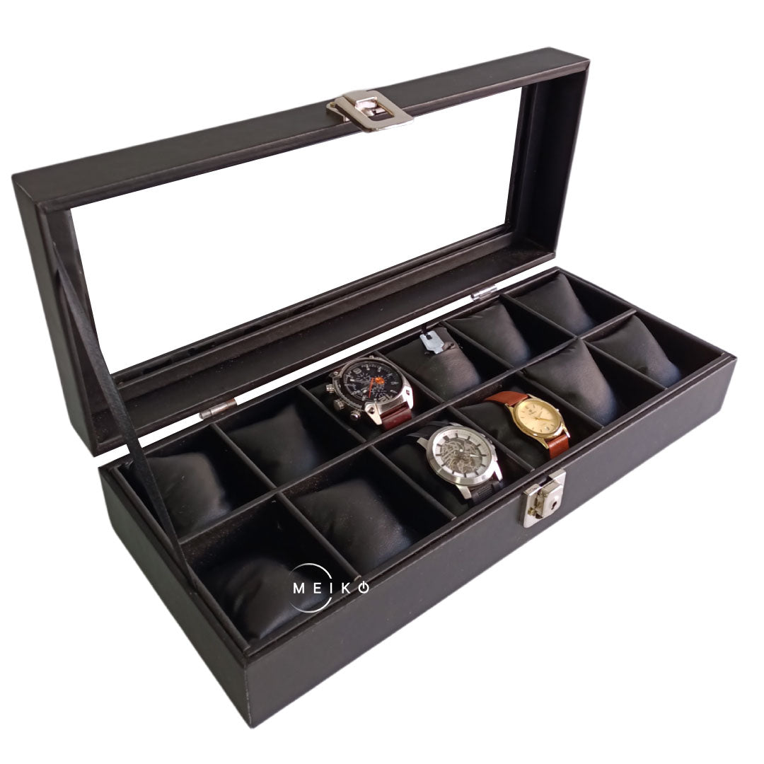 Caja relojera por 12 puestos de lujo. Un regalo perfecto y un accesorio necesario para los amantes de los relojes. Puedes organizarlos y llevarlos de viaje o simplemente para protegerlos en casa. Puedes guardar también manillas o joyas lujosas retirando las almohadillas.