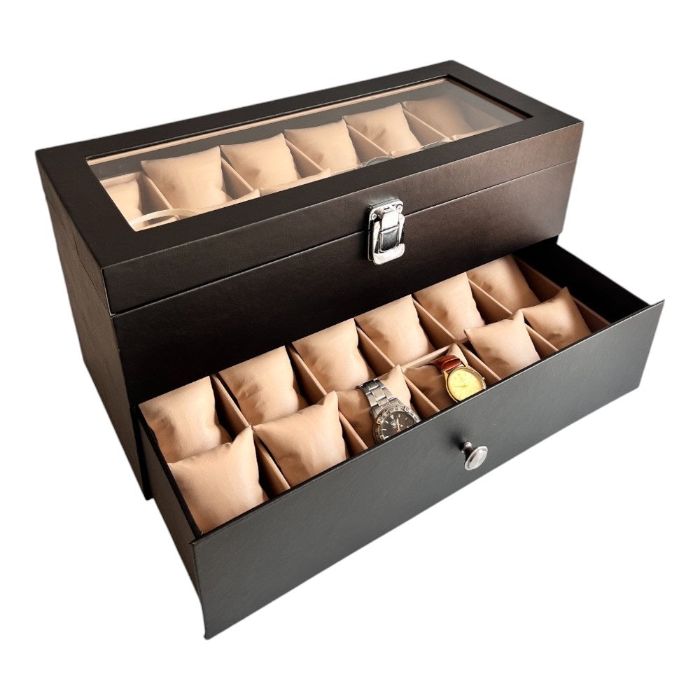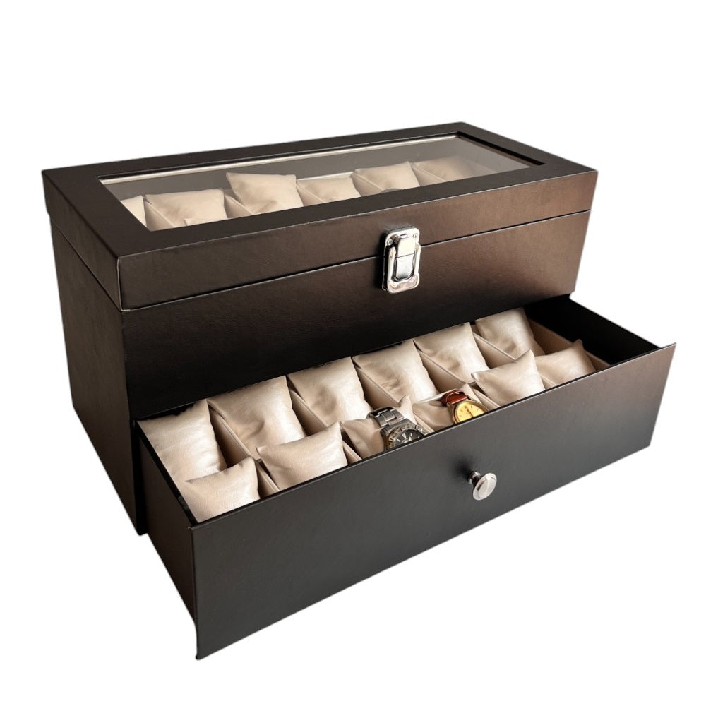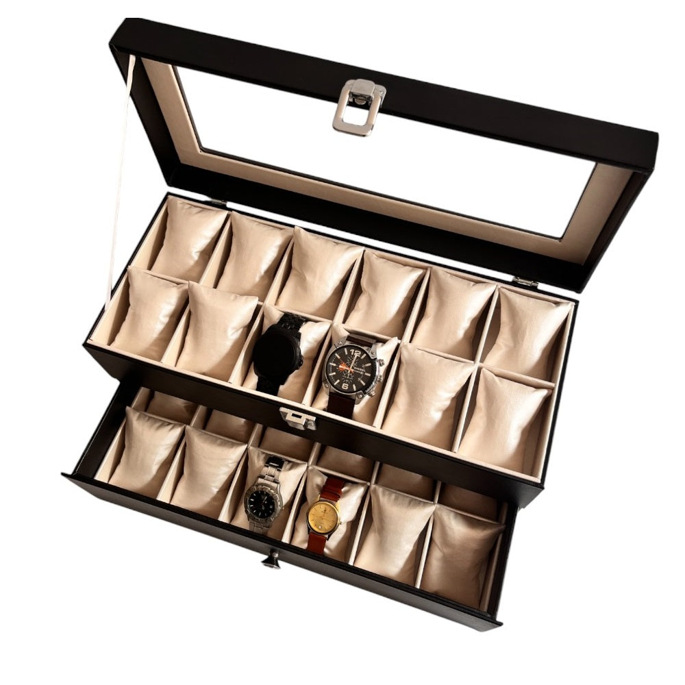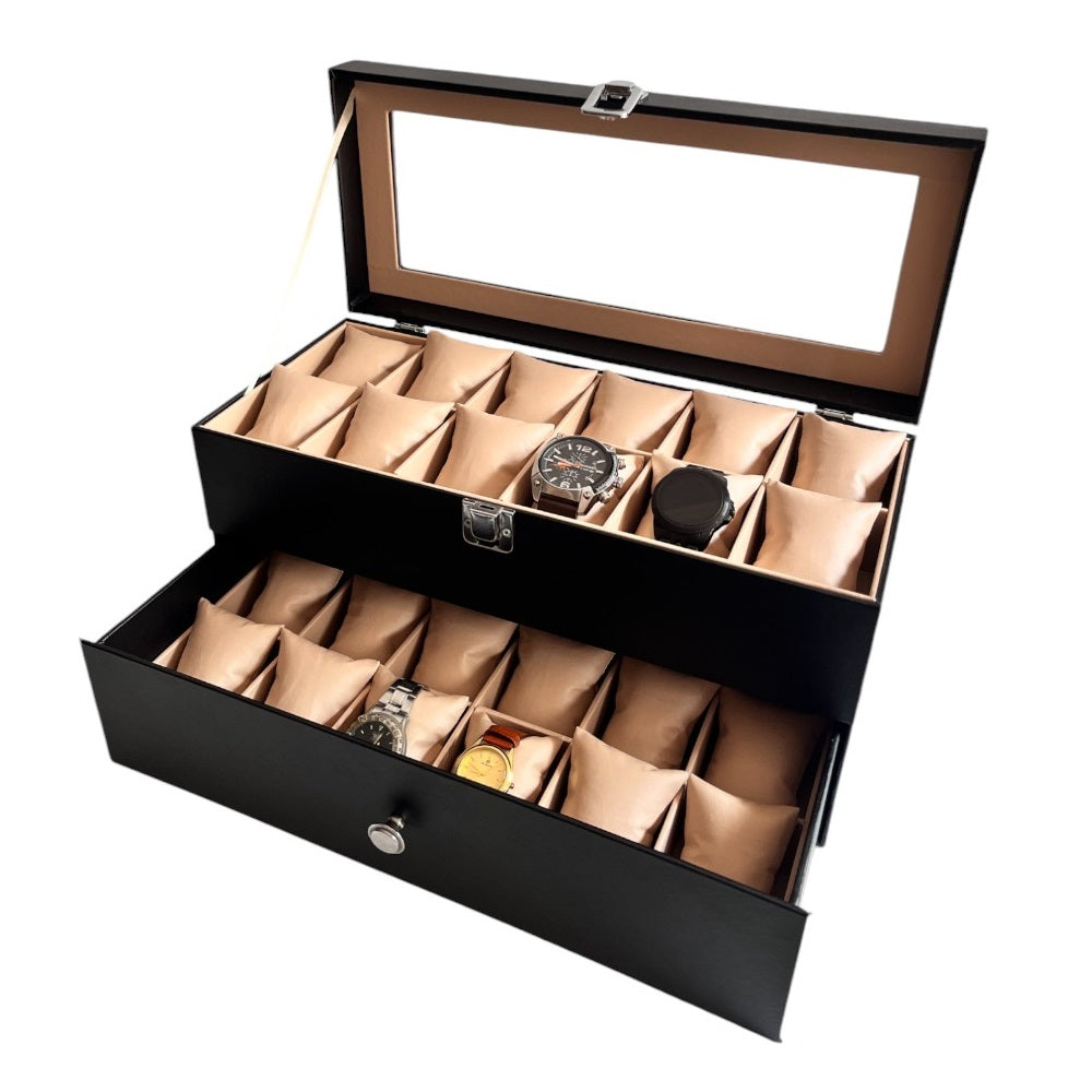 Caja relojera organizadora de 24 puestos con cajón. Un regalo perfecto y un accesorio necesario para los amantes de los relojes. Puedes organizarlos y llevarlos de viaje o simplemente para protegerlos en casa. Puedes guardar también manillas o joyas lujosas retirando las almohadillas.