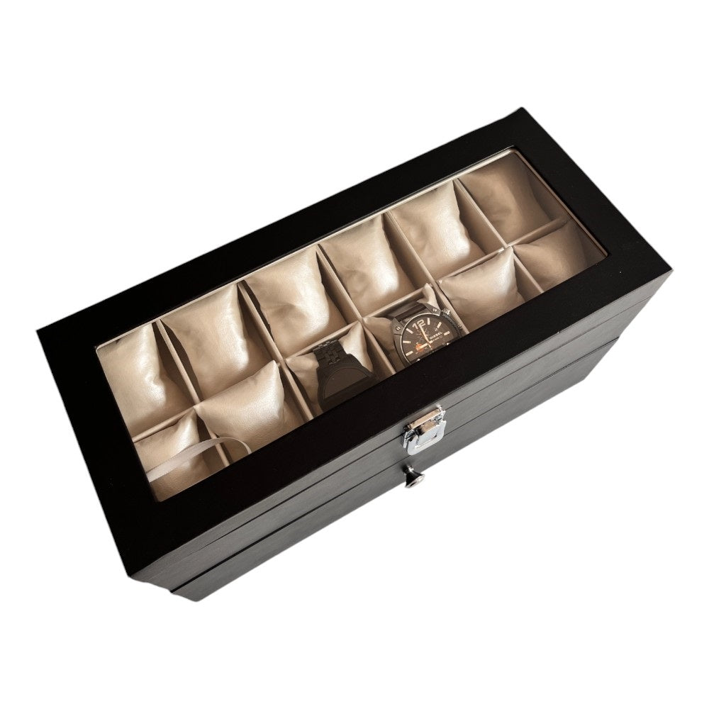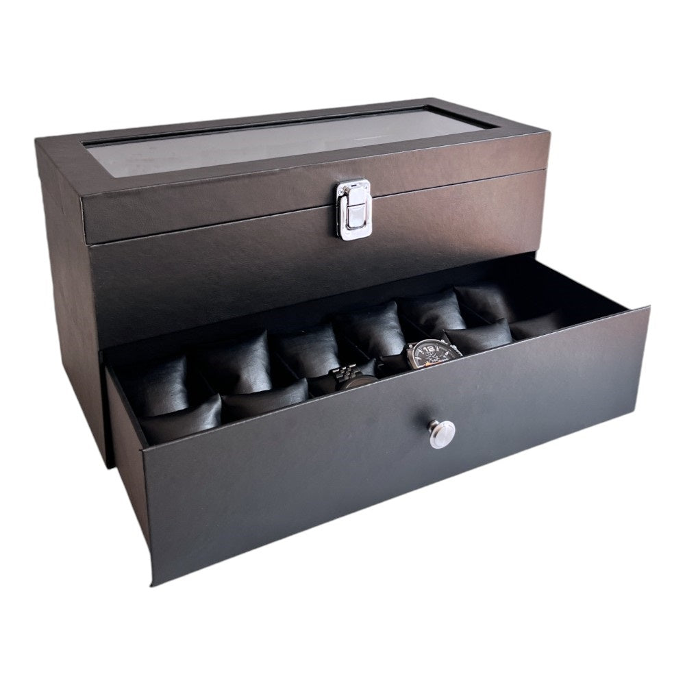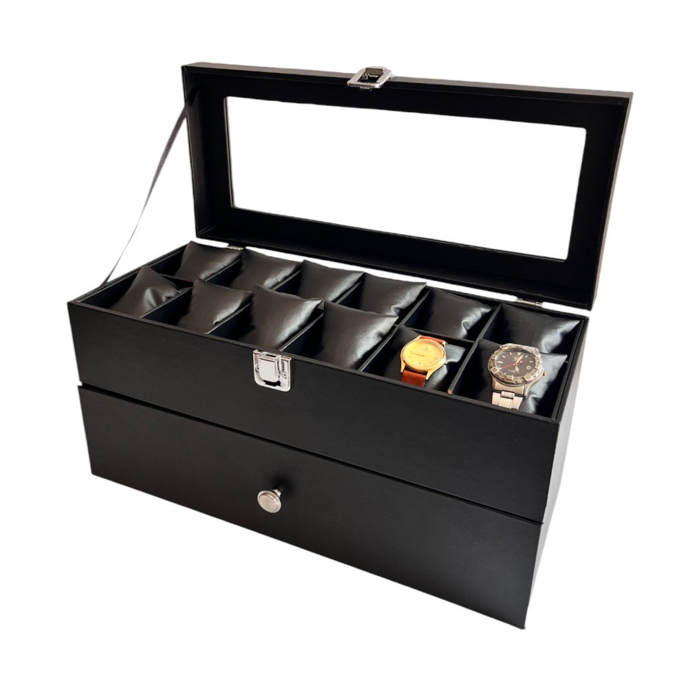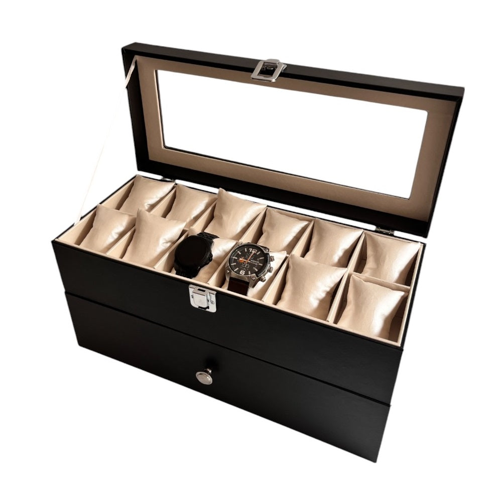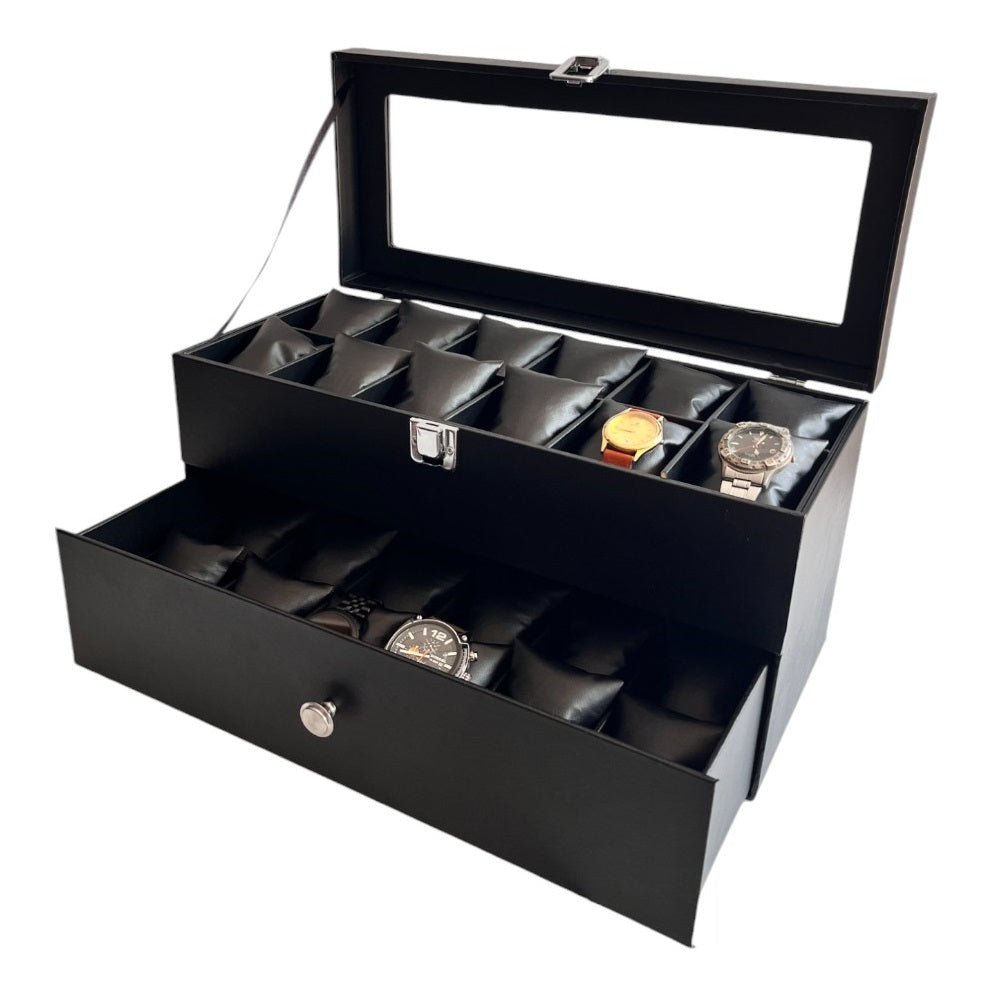 Caja relojera organizadora de 24 puestos con cajón. Un regalo perfecto y un accesorio necesario para los amantes de los relojes. Puedes organizarlos y llevarlos de viaje o simplemente para protegerlos en casa. Puedes guardar también manillas o joyas lujosas retirando las almohadillas.