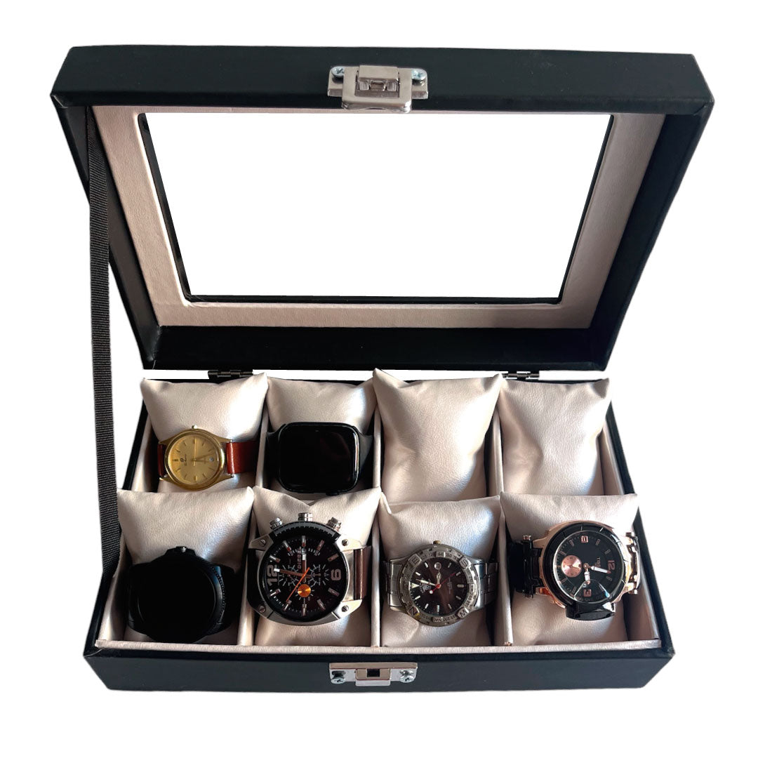 Caja relojera organizadora de 8 puestos con cajón. Un regalo perfecto y un accesorio necesario para los amantes de los relojes. Puedes organizarlos y llevarlos de viaje o simplemente para protegerlos en casa. Puedes guardar también manillas o joyas lujosas retirando las almohadillas.