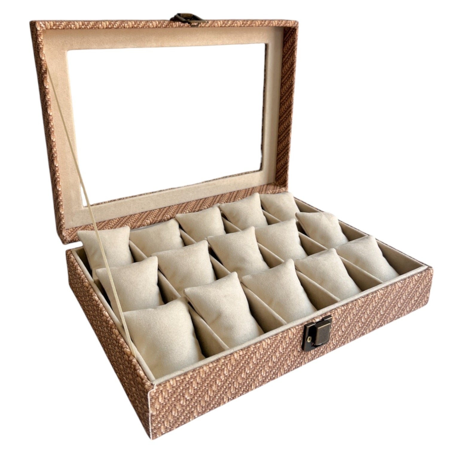 Caja relojera organizadora de 15 puestos con cajón. Un regalo perfecto y un accesorio necesario para los amantes de los relojes. Puedes organizarlos y llevarlos de viaje o simplemente para protegerlos en casa. Puedes guardar también manillas o joyas lujosas retirando las almohadillas.