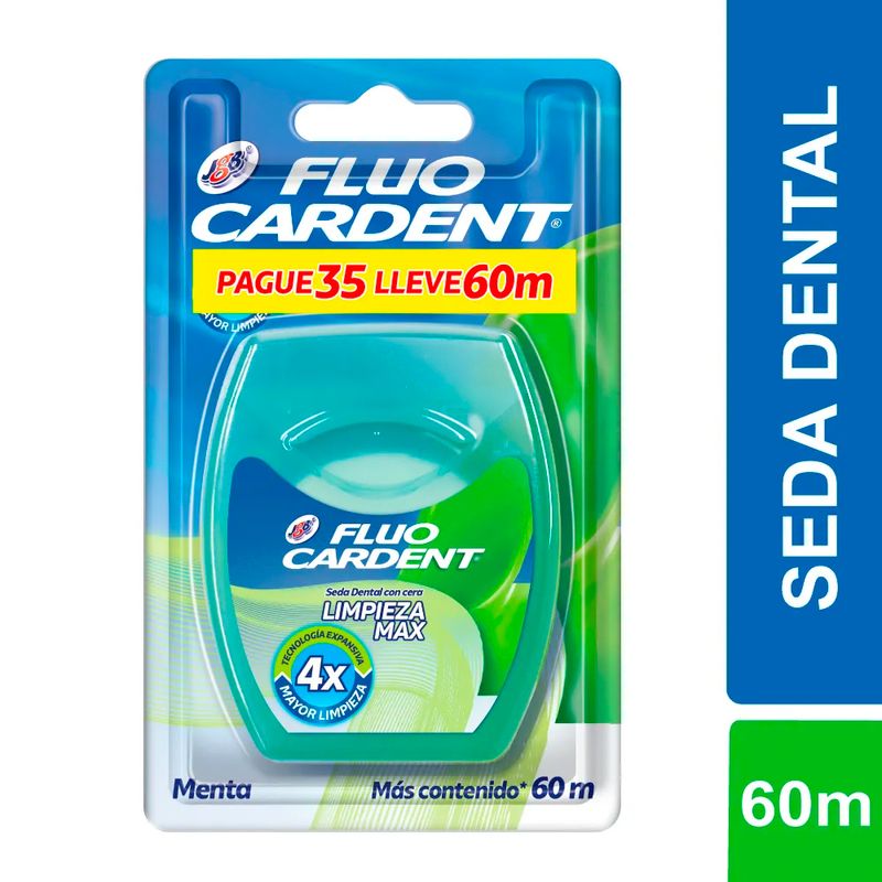 Obtén una limpieza dental completa y garantiza la salud de tus encÃas. La Seda Dental FluocarDent está diseñada para limpiar eficazmente entre los dientes, eliminando placa y residuos de alimentos. Su presentación de 60 metros te brinda un mayor tiempo de uso y la confianza de una limpieza bucal óptima.