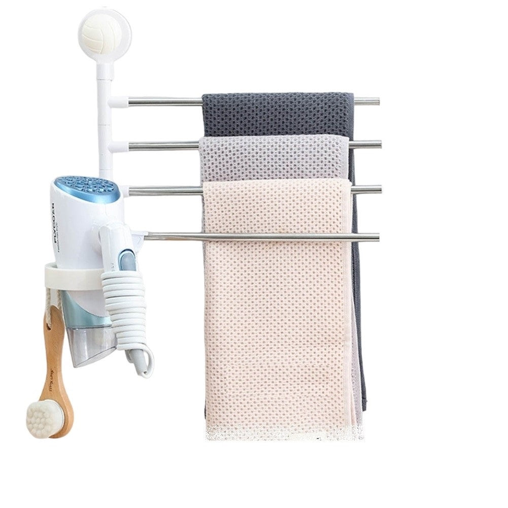Toallero porta secador minimalista de 4 niveles. La solución perfecta para ordenar tu baño o salón de belleza. Contiene 4 tubos giratorios para toallas u otros implementos + aro para poner el secador. Puedes mover y deslizar cada barra de hierro como desees.