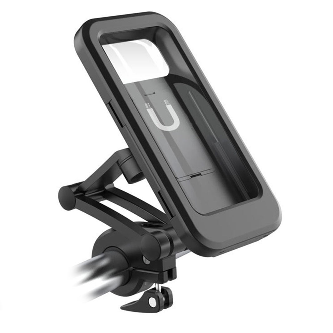 Funda de teléfono con diseño completamente cerrado para usar en la bicicleta o la moto. Proporciona un nivel IPX4 de rendimiento impermeable. Se adapta a teléfonos inteligentes de hasta 6,5 pulgadas. Amplia aplicación para la mayoría de los manillares con un diámetro de 22,2mm (0,87 ") a 28,6mm (1,13").